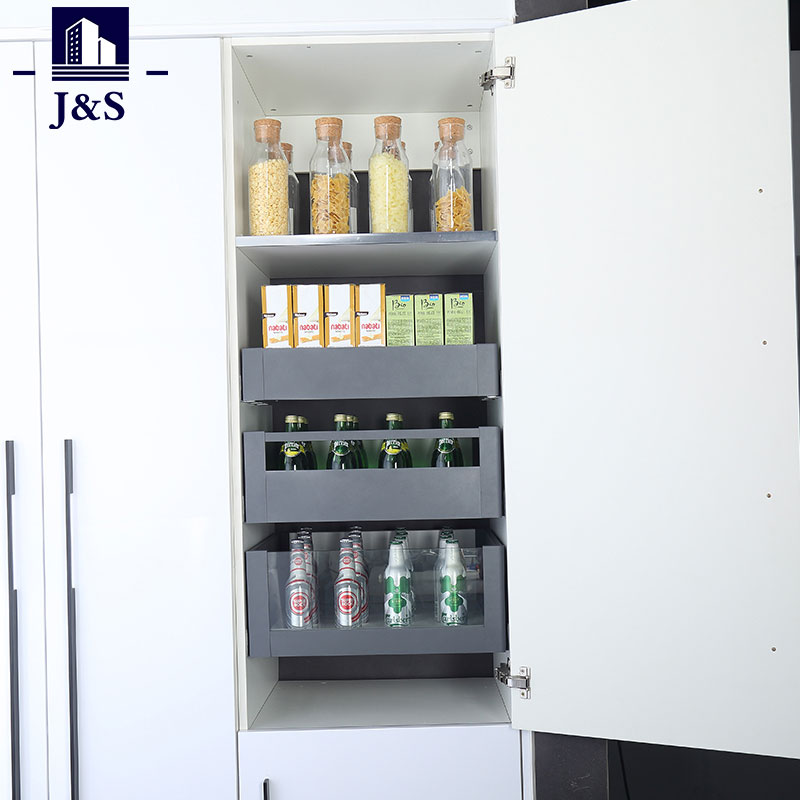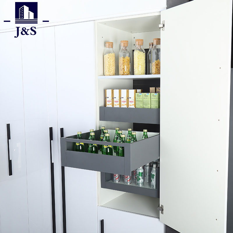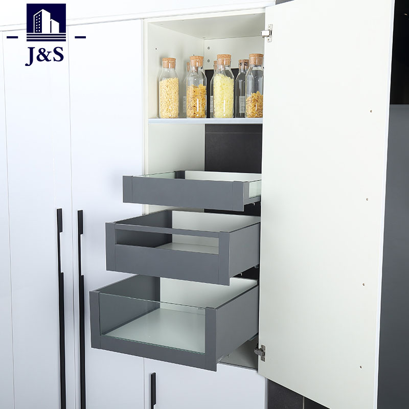 Kitchen Insert Slow Motion Drawer Soft Close Slides Tandem Box minangka piring sisih baja telung lapisan kanthi damping sing dibangun, uga dikenal minangka pumping damping mewah. luwih ngalangi lan awet saka telung bagean guide alur.